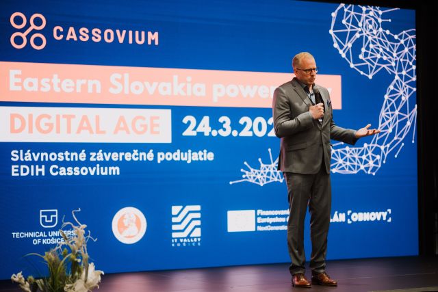 Generálny manažér projektu Miroslav Michalko predstavil projekt z hľadiska ponúkaných služieb a dosiahnutých výsledkov. Vyzdvihol unikátnosť zloženia konzorcia, kde dominovali akademickí partneri, ktorí vytvorili synergický efekt so združením Košice IT Valley. Juraj Girman načrtol, ako by malo vyzerať digitálne východné Slovensko o pár rokov a čo pre to treba urobiť dnes. Konkrétne príbehy klientov, ktorí využili služby EDIH Cassovium, ukázali, že digitalizácia nie je buzzword, ale nástroj, ktorý funguje. Panelová diskusia s Gabrielom Semanišinom a Jurajom Gazdom poukázala na kvalitatívne rozdiely medzi procesom informatizácie a digitalizácie a prekážky, ktoré bránia tomu, aby sa proces digitálnej transformácie rozbehol všade tam, kde je potrebný.