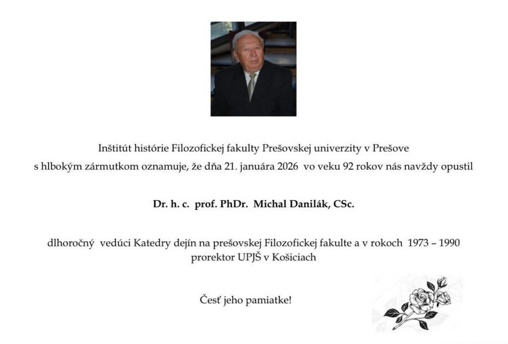 S veľkým zármutkom sme prijali správu o úmrtí Dr. h. c. prof. PhDr. Michala Daniláka, CSc., ktorý významným spôsobom prispel k rozvoju Univerzity Pavla Jozefa Šafárika v Košiciach vo viacerých funkciách: