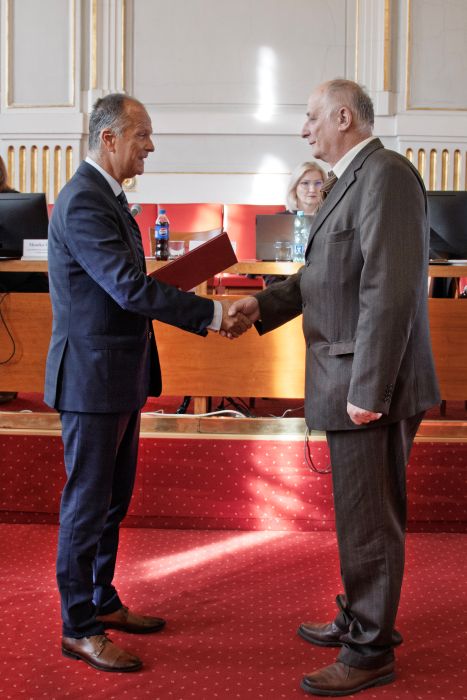 Rektor UPJŠ Daniel Pella odovzdal menovací dekrét „profesor emeritus“ profesorovi Štefanovi Šutajovi  počas zasadnutia Vedeckej rady UPJŠ, ktoré sa konalo 3. októbra 2025 v Historickej aule. Profesor Šutaj dosiahol počas pôsobenia na UPJŠ významné úspechy a prispel tak k rozvoju vedy a vzdelávania na našej univerzite.