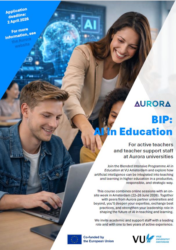 This course combines online sessions with an on-site week in Amsterdam (22–26 June 2026). Together with peers from Aurora partner universities and beyond, you’ll deepen your expertise, exchange best practices, and strengthen your leadership role in shaping the future of AI in teaching and learning.