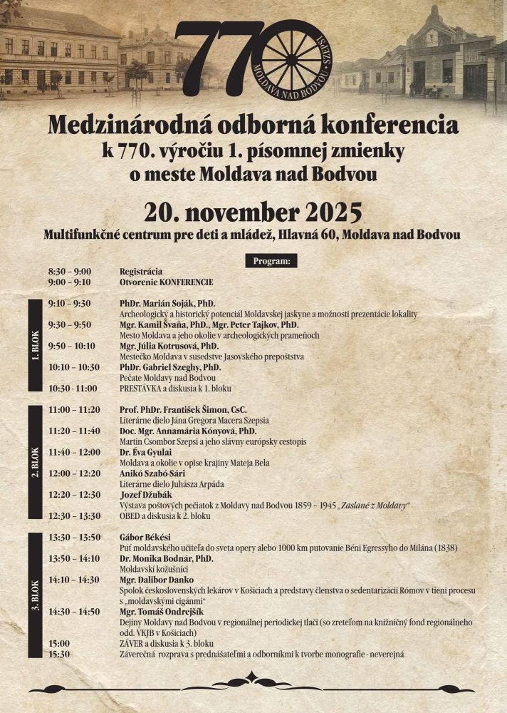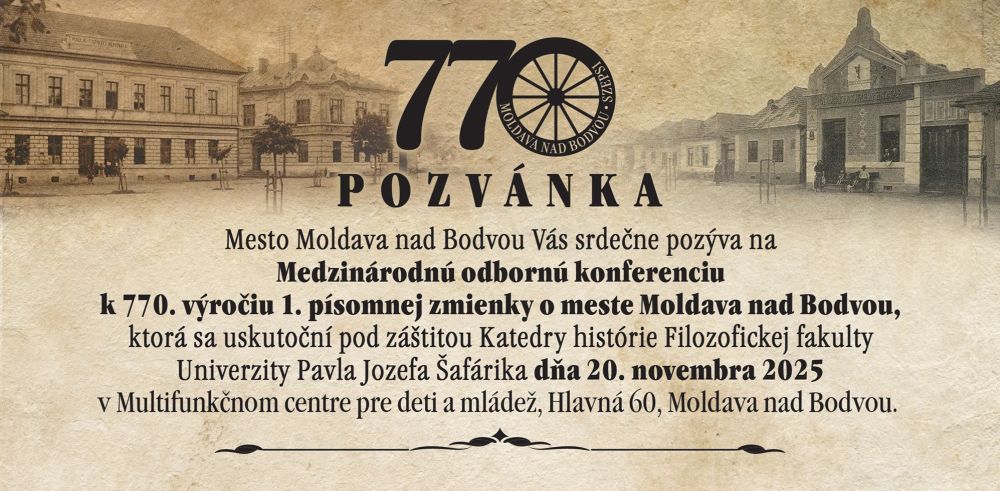 Mesto Moldava nad Bodvou pozýva na Medzinárodnú odbornú konferenciu k 770. výročiu prvej písomnej zmienky o meste Moldava nad Bodvou, ktorá sa uskutoční pod záštitou Katedry histórie Filozofickej fakulty UPJŠ v Košiciach dňa 20. novembra 2025 so začiatkom o 9.00 hod. v Multifunkčnom centre pre deti a mládež na Hlavnej 60 v Moldave nad Bodvou.