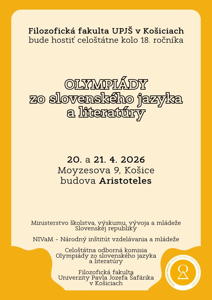 Filozofická fakulta UPJŠ v Košiciach bude v dňoch 20. a 21. apríla 2026 hostiť celoštátne kolo 18. ročníka Olympiády zo slovenského jazyka a literatúry.