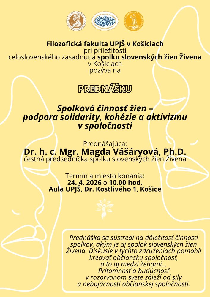 Filozofická fakulta UPJŠ v Košiciach pri príležitosti celoslovenského zasadnutia spolku slovenských žien Živena v Košiciach pozýva na prednášku čestnej predsedníčky Živeny Dr. h. c. Mgr. Magdy Vášáryovej, Ph.D., pod názvom Spolková činnosť žien – podpora solidarity, kohézie a aktivizmu v spoločnosti, ktorá sa uskutoční v piatok 24. apríla 2026 o 10.00 hod. v Aule UPJŠ na Ul. Dr. Kostlivého 1 v Košiciach.