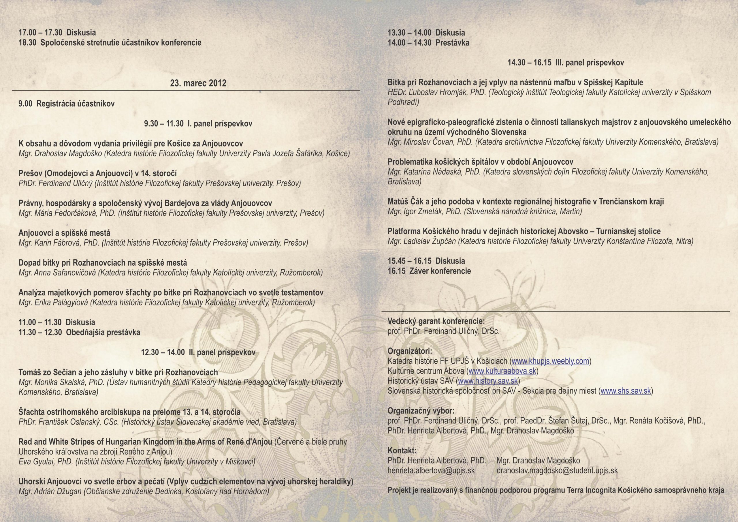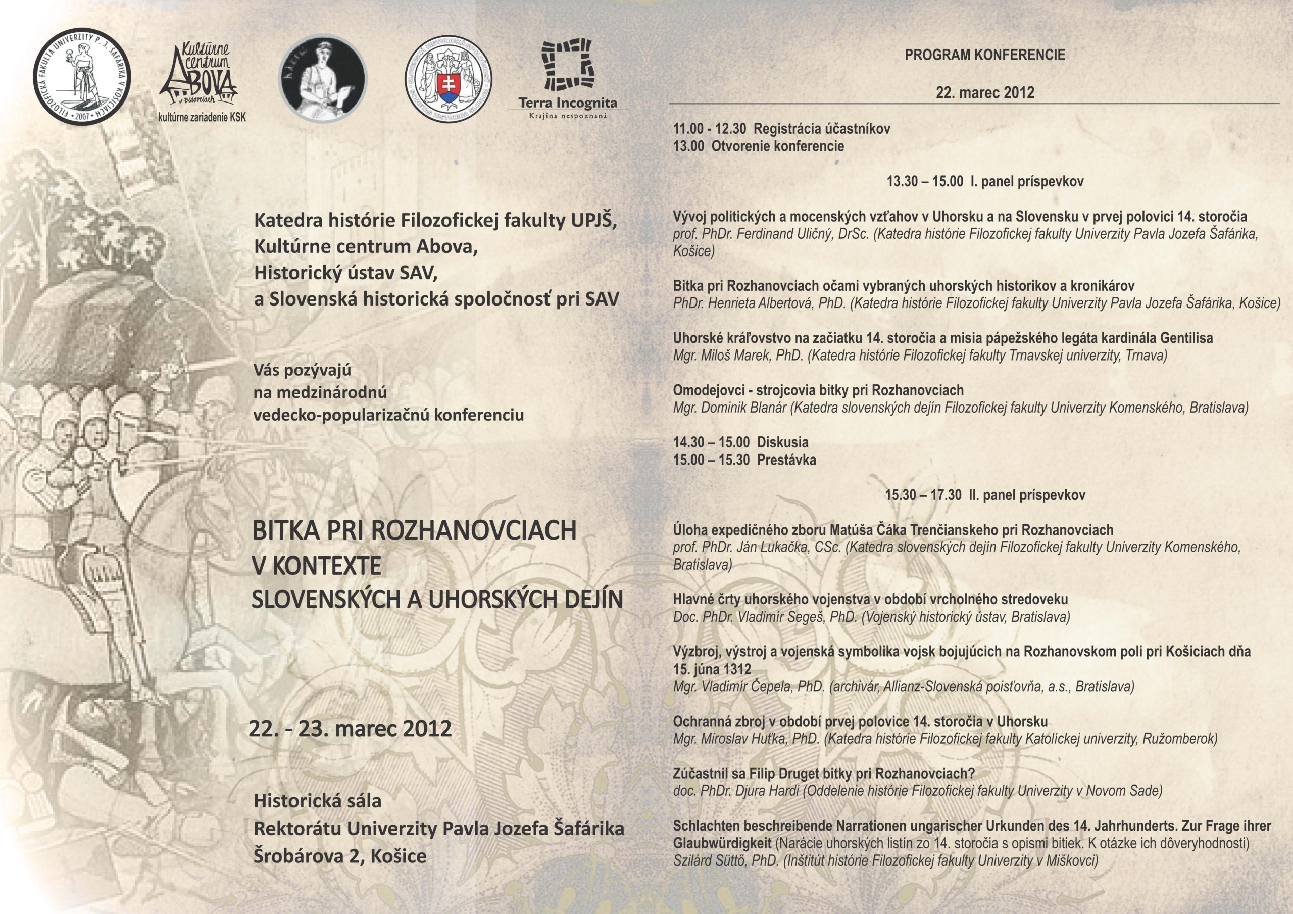 - Bitka pri Rozhanovciach v kontexte slovenských a uhorských dejín, 22. – 23. marec 2012, Košice, konferencia k 700. výročiu známej bitky (program 1, program 2)