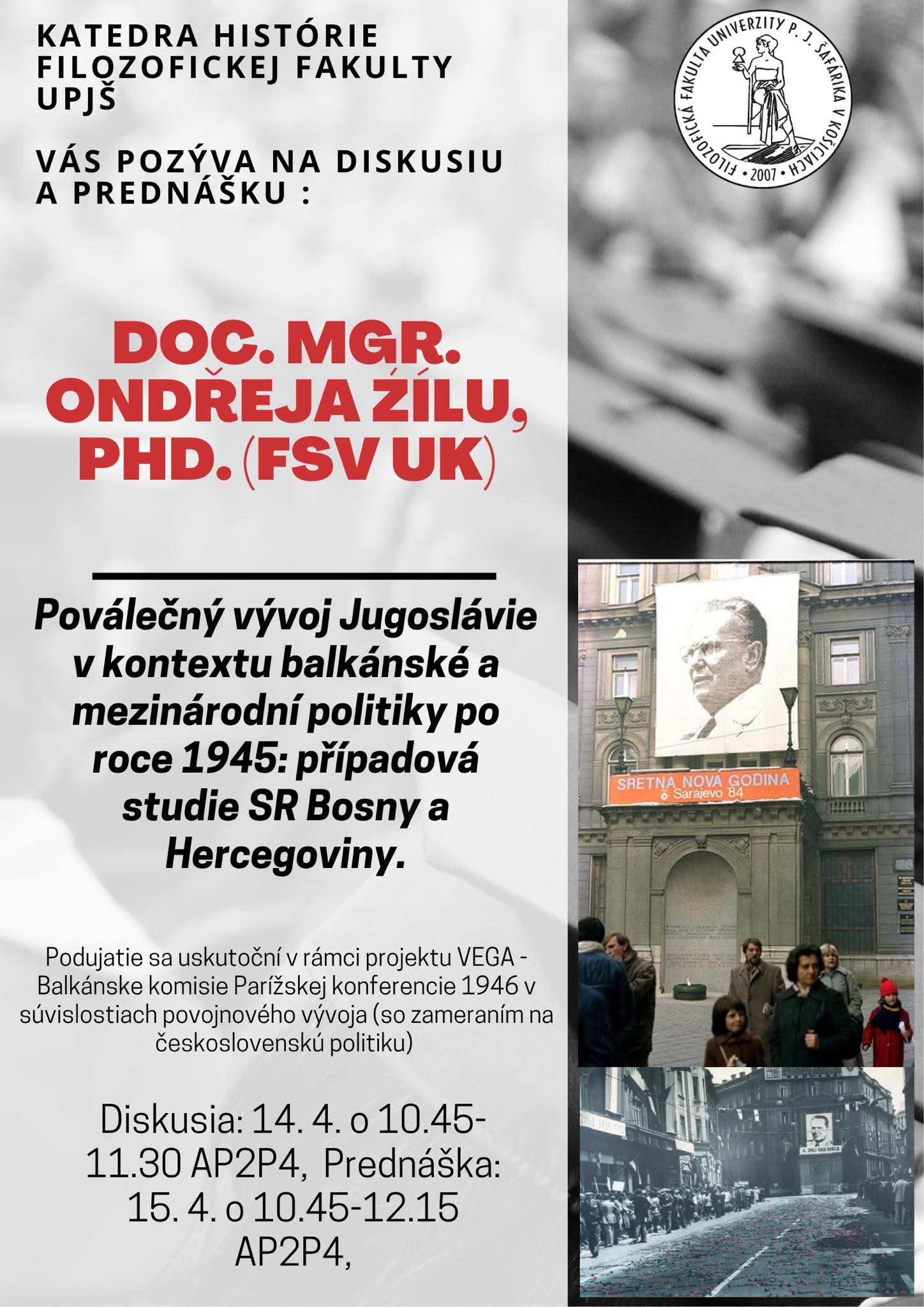 - 14/04/2026: Poválečný vývoj Jugoslávie v kontextu balkánské a mezinárodní politiky po roce 1945: případová studie SR Bosny a Hercegoviny, prednáška doc. Mgr. Ondřeja Žílu, PhD., z Fakulty sociálnych vied Univerzity Karlovej v Prahe, Košice (plagát)