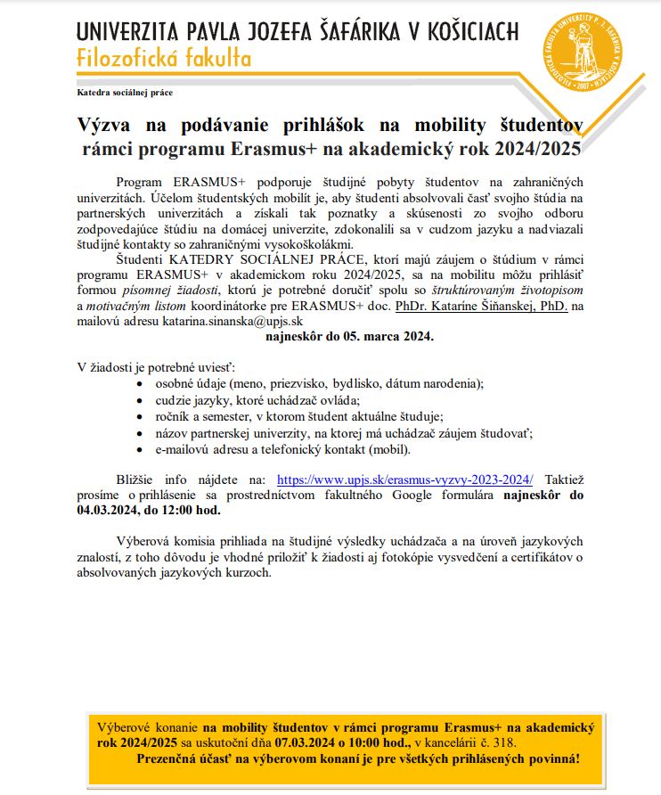 Študentky a študenti KSP FF UPJŠ majú aj v zimnom semestri 2024/2025 možnosť prihlásiť sa na mobilitu v rámci výzvy Erasmus+. Ďalšie informácie nájdete na tomto linku.