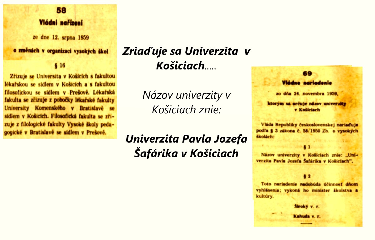 1959 – staré univerzitné tradície boli obnovené založením Univerzity Pavla Jozefa Šafárika v Košiciach, ktorá pozostávala z Lekárskej fakulty v Košiciach a Filozofickej fakulty v Prešove (Lekárska fakulta existovala od roku 1949 ako súčasť Univerzity Komenského v Bratislave).