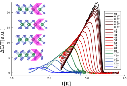 Obr.: Merania tepelnej kapacity ukázali, že ani magnetické pole s indukciou 8 T, čo je maximum dostupné v košických laboratóriách, nedokázalo potlačiť supravodivosť v NbSe₂ (čierne a červené krivky). Preto sa uskutočnili aj ďalšie merania vo Francúzsku (zelené a modré krivky). Inset: Usporiadanie vrstiev NbSe2 má narušenú inverznú symetriu.