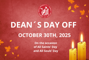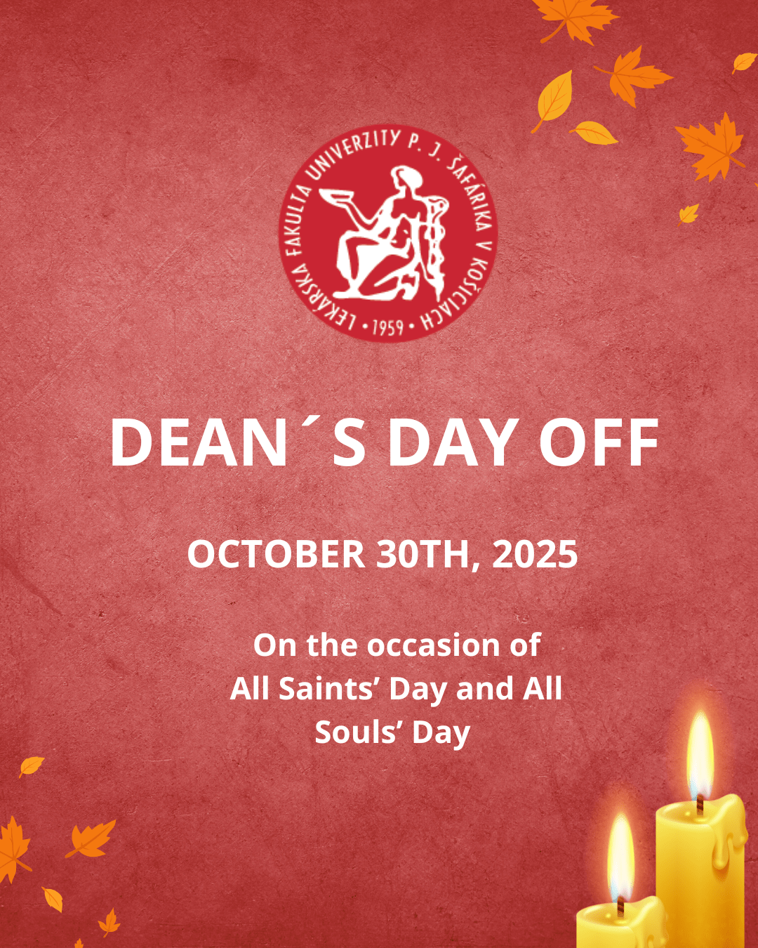 The Dean of the Faculty of Medicine, Pavol Jozef Šafárik University in Košice, prof. MUDr. Peter Jarčuška, PhD., grants students DEAN’ S DAY OFF on October 30, 2025 on the occasion of All Saints’ Day and All Souls’ Day. No classes will be held on this day.