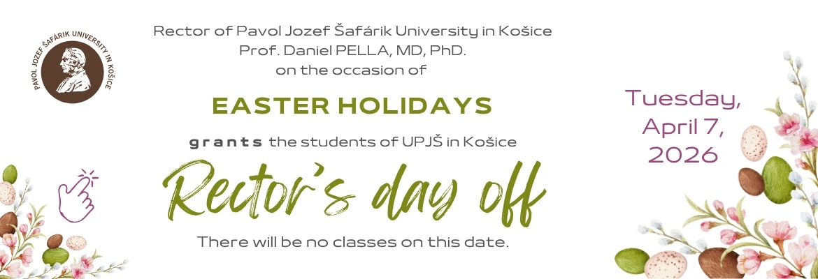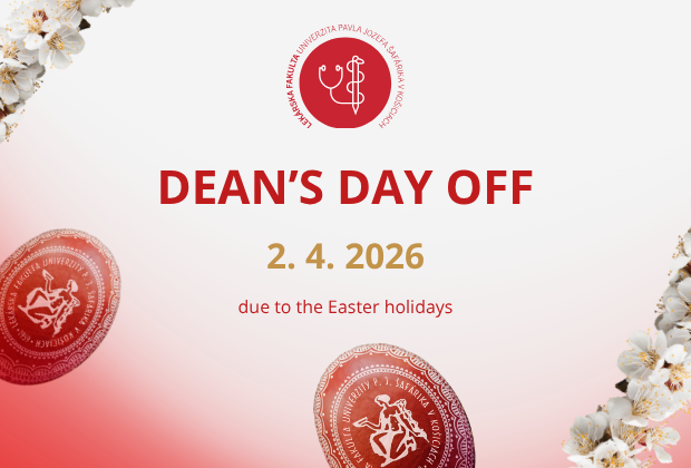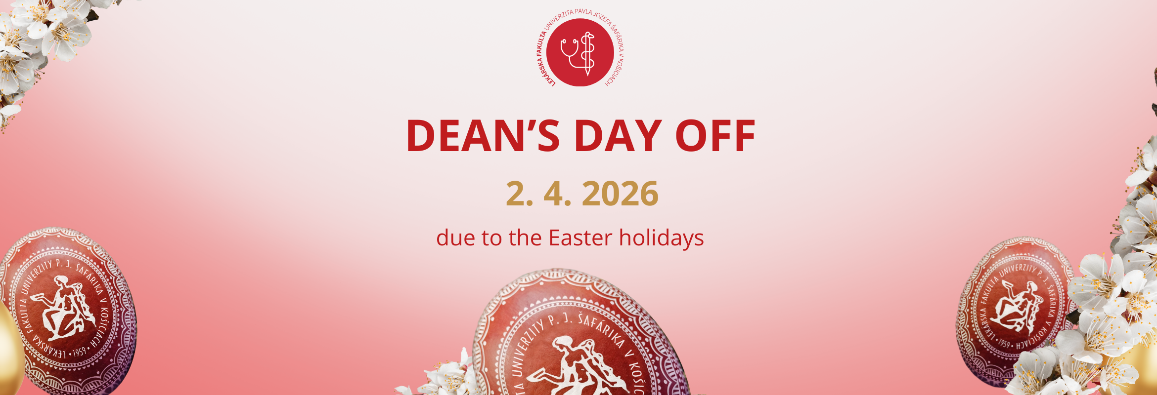 📢 The Dean of the Faculty of Medicine, Pavol Jozef Šafárik University in Košice, prof. Peter Jarčuška, M.D., PhD., grants a Dean’s Day Off on the occasion of the Easter holidays. 🗓 The day off will take place on Thursday, April 2, 2026. There are not any classes on the given day. 🎉 We wish … Continued