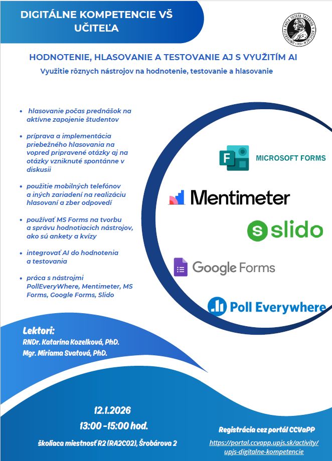 Univerzita Pavla Jozefa Šafárika v Košiciach ponúka vysokoškolským učiteľom a doktorandom UPJŠ možnosť absolvovať vzdelávací kurz Digitálne kompetencie VŠ učiteľa, ktorý podporuje ich profesijný rozvoj. Dňa 12.1.2026 budú mať možnosť zúčastniť sa aktivity zameranej na rozvoj digitálnych kompetencií.