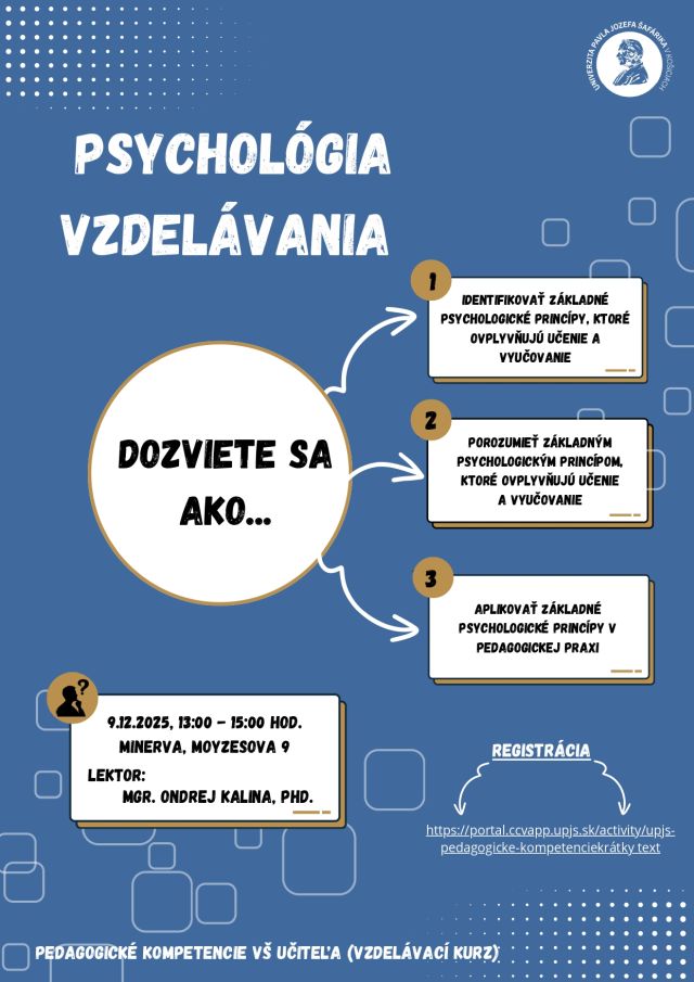 Univerzita Pavla Jozefa Šafárika v Košiciach ponúka vysokoškolským učiteľom a doktorandom UPJŠ možnosť absolvovať vzdelávací kurz Pedagogické kompetencie VŠ učiteľa, ktorý podporuje ich profesijný rozvoj. Dňa 9. 12. 2025 budú mať možnosť  zaoberať sa témou „Psychológia vzdelávania“ v rámci interaktívneho workshopu, ktorý poskytne prehľad o psychologických teóriách učenia, vrátane kognitívnej, behaviorálnej a sociálnej psychológie. Naučia sa identifikovať a porozumieť základným psychologickým princípom, ktoré ovplyvňujú učenie a vyučovanie a aplikovať základné psychologické princípy v pedagogickej praxi.