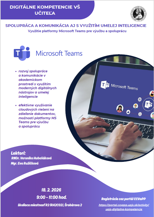 UPJŠ v Košiciach ponúka vysokoškolským učiteľom a doktorandom UPJŠ možnosť absolvovať vzdelávací kurz Digitálne kompetencie VŠ učiteľa, ktorý podporuje ich profesijný rozvoj.