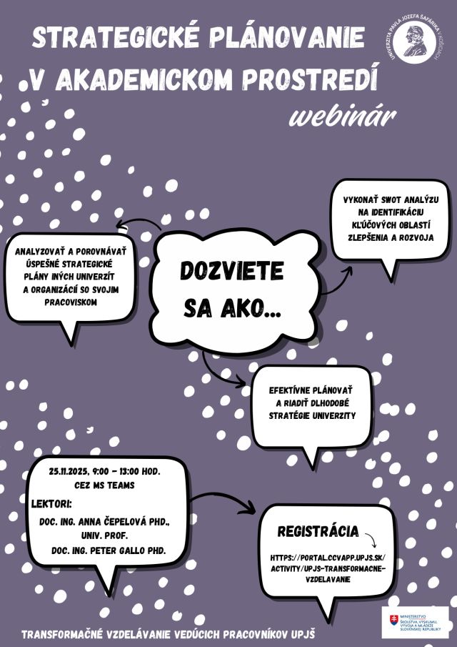 Univerzita Pavla Jozefa Šafárika v  Košiciach ponúka vedúcim zamestnancom všetkých pracovísk UPJŠ možnosť rozvíjať svoje líderske zručnosti. Dňa 25.11. 2025 budú mať možnosť zaoberať sa témou „Strategické plánovanie v akademickom prostredí“. Naučia sa ako efektívne plánovať a riadiť dlhodobé stratégie univerzity. Budú pracovať na reálnych strategických plánoch pre svoje pracoviská (fakulty, ústavy, katedry, oddelenia). Vykonajú SWOT analýzu na identifikáciu kľúčových oblastí zlepšenia a rozvoja. V diskusii budú analyzovať a porovnávať úspešné strategické plány iných univerzít a organizácii so svojim pracoviskom.