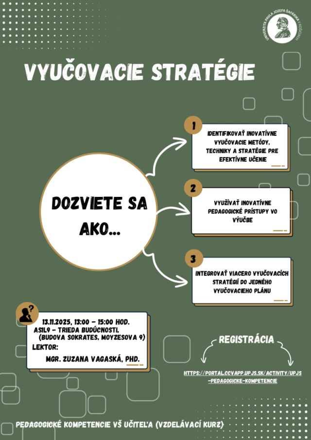 Univerzita Pavla Jozefa Šafárika v Košiciach ponúka vysokoškolským učiteľom a doktorandom UPJŠ možnosť absolvovať vzdelávací kurz Pedagogické kompetencie VŠ učiteľa, ktorý podporuje ich profesijný rozvoj. Dňa 13.11.2025 budú mať možnosť  zaoberať sa témou „Vyučovacie stratégie“ v rámci workshopu zameraného na inovatívne prístupy k výučbe, ktoré využívajú najnovšie techniky a pedagogické teórie. Pokrýva nové trendy vo vzdelávaní, ako adaptívne učenie, kolaboratívne učenie, kompetenčne orientované vzdelávanie, či personalizované vzdelávanie. Zameriava sa na praktické aplikácie týchto inovácií vo vysokoškolskej výučbe.