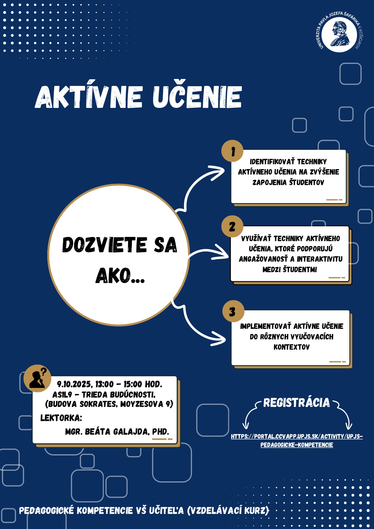 Dňa 9.10.2025 budú mať možnosť  zaoberať sa témou „Aktívne učenie“ v rámci workshopu zameraného na metódy, ktoré aktívne zapájajú študentov do procesu učenia. Patria sem diskusie, skupinové práce, riešenie problémov, simulácie a ďalšie interaktívne techniky, ktoré zvyšujú angažovanosť, podporujú hlbšie pochopenie učiva a vytvárajú stimulujúce učebné prostredie podporujúce kritické myslenie a tvorivosť.