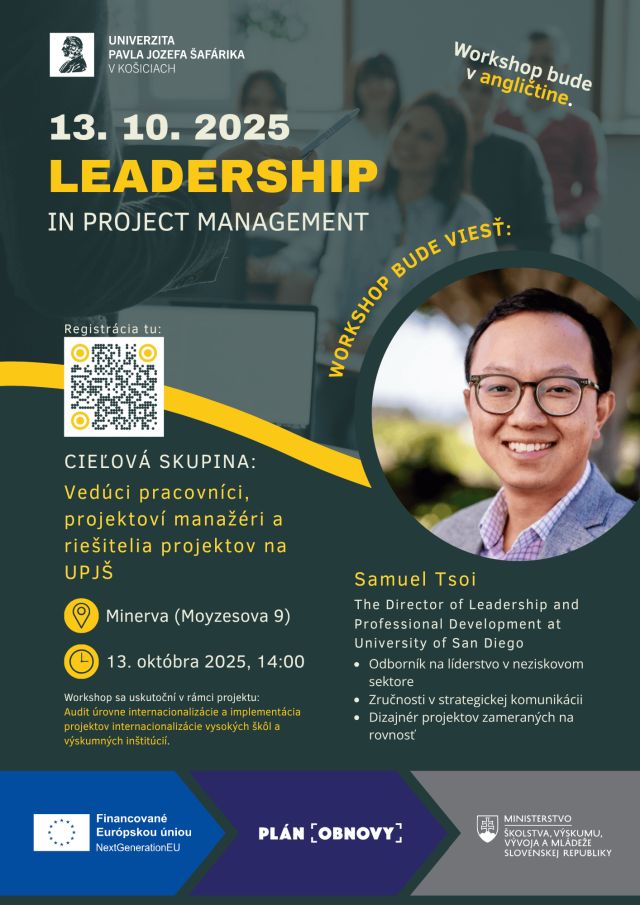Úsek medzinárodných vzťahov a internacionalizácie pozýva vedúcich pracovníkov, projektových manažérov, výskumníkov a riešiteľov na workshop so zahraničným expertom Samuelom Tsoiom z University of San Diego na tému Leadership in Project Management, ktorý sa bude konať v rámci aktivít Akčného plánu vypracovaného v zmysle projektu Audit úrovne internacionalizácie a implementácia projektov internacionalizácie vysokých škôl a verejných výskumných inštitúcií. Cieľom workshopu je poskytnúť praktické poznatky a skúsenosti z oblasti vedenia tímov a riadenia projektov.