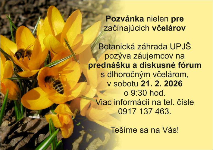 Pozývame vás na prednášku pre amatérov i profesionálov o včelárčení v termíne 21.2.2026 o 9:30. Na prednášku je potrebné uhradiť vstupné do botanickej záhrady. Tešíme sa na vás.