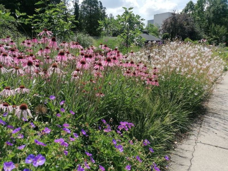 Kvitnúce dreviny a kríky ľaliovník tulipánokvetý (Liriodendron tulipifera), magnólia veľkokvetá (Magnolia grandiflora), paulovnia plstnatá (Paulownia tomentosa), katalpa úhľadná (Catalpa speciosa), druhy a kultivary rodu ruža (Rosa). Dreviny s farebnými listami buk lesný f. purpurea (Fagus sylvatica f. purpurea), javor dlaňovitolistý s kultivarmi (Acer palmatum cv.) a iné.