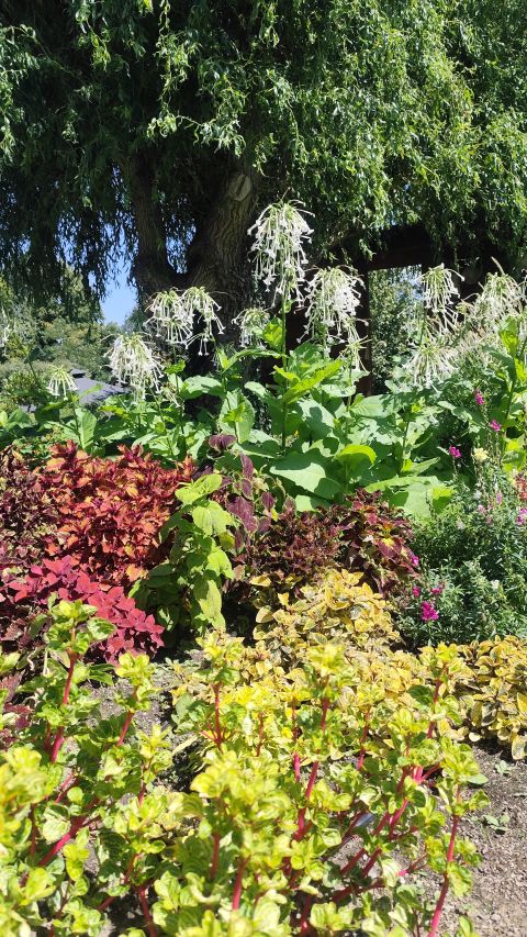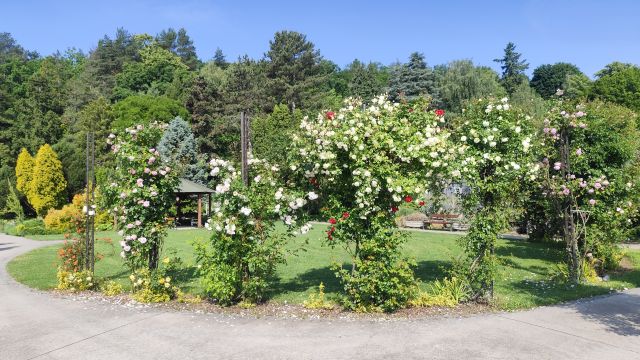 Kvitnúce dreviny a kríky ľaliovník tulipánokvetý (Liriodendron tulipifera), magnólia veľkokvetá (Magnolia grandiflora), paulovnia plstnatá (Paulownia tomentosa), katalpa úhľadná (Catalpa speciosa), druhy a kultivary rodu ruža (Rosa). Dreviny s farebnými listami buk lesný f. purpurea (Fagus sylvatica f. purpurea), javor dlaňovitolistý s kultivarmi (Acer palmatum cv.) a iné.