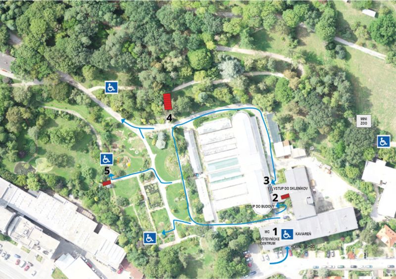 - Pred vstupom do skleníka sa nachádzajú 2 schody. Je možné ich obísť cez záhradu okolo skleníkov (modrá čiara na mape okolo skleníkov). Táto možnosť je najjednoduchšia a najviac pohodlná.