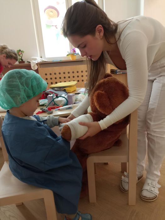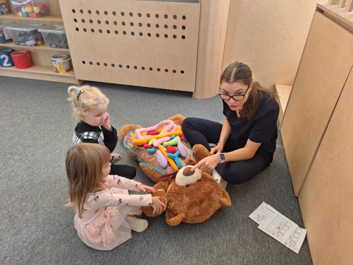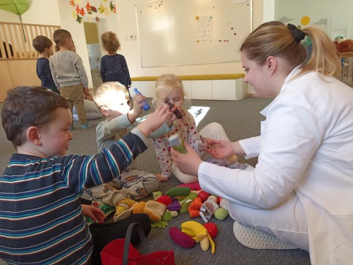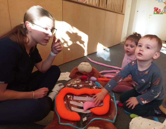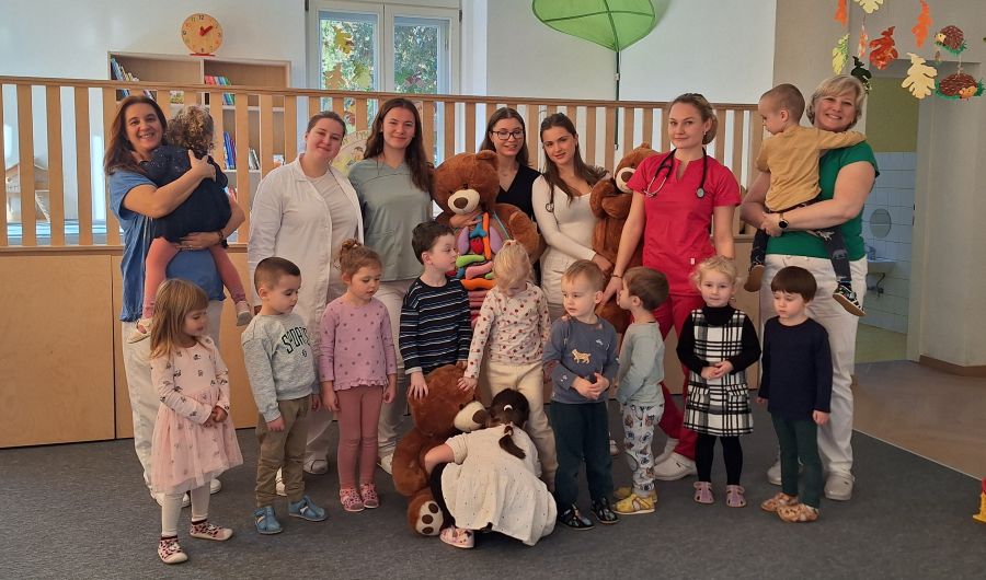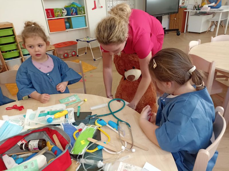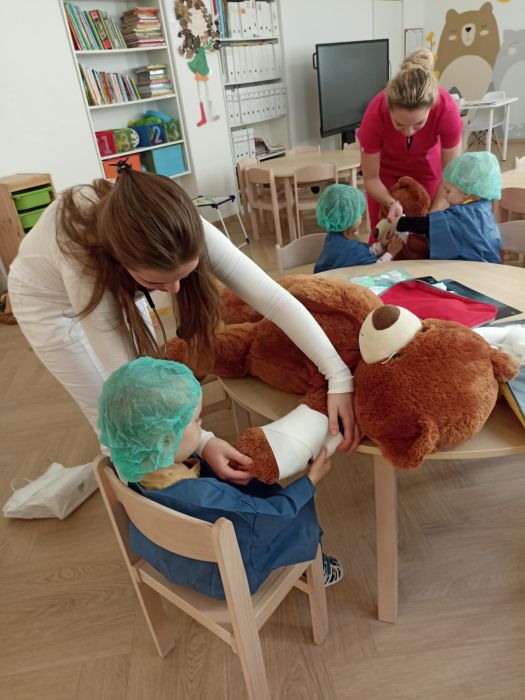 Deti sa oboznámili s vnútornými orgánmi tela a s lekárskymi nástrojmi. Ošetrovali chorého medvedíka 🐻, porozprávali sa o zdravej výžive a vyskúšali si ako prebieha vyšetrenie u očného lekára. Na záver získali diplom a malú sladkú odmenu 📜🍬.