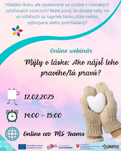 Hľadáte lásku, ale opakovane sa ocitáte v rovnakých vzťahových vzorcoch? Máš pocit, že dávaš veľa, no vo vzťahoch sa napriek tomu cítiš neistý/-tá, vyčerpaný/-á alebo prehliadaný/-á? Tento webinár je pozvaním zastaviť sa a pozrieť sa na lásku inak – bez ružových okuliarov, ale s rešpektom k sebe. Počas webináru sa pozrieme na najčastejšie mýty o láske, ktoré si nesieme z detstva, rodiny, spoločnosti či romantických príbehov – a ktoré často nevedome ovplyvňujú naše partnerské rozhodnutia. Nejde o to, ako si udržať vzťah za každú cenu, ale ako si vyberať vzťahy, v ktorých môžeme byť sami sebou. Ten pravý/- tá pravá  partner/-rka neprichádza vtedy, keď sa snažíme byť lepší, tichší alebo prispôsobivejší. Často prichádza až vtedy, keď sa začneme k sebe správať s rešpektom a láskavosťou. Ak cítite, že je čas prestať hľadať lásku vonku a začať ju budovať zvnútra, tento webinár je pre vás. Prihláste sa na webinár 12.2.2026 o 14.00 a doprajte si nový pohľad na lásku. Registrácia prebieha cez portál CCVaPP.