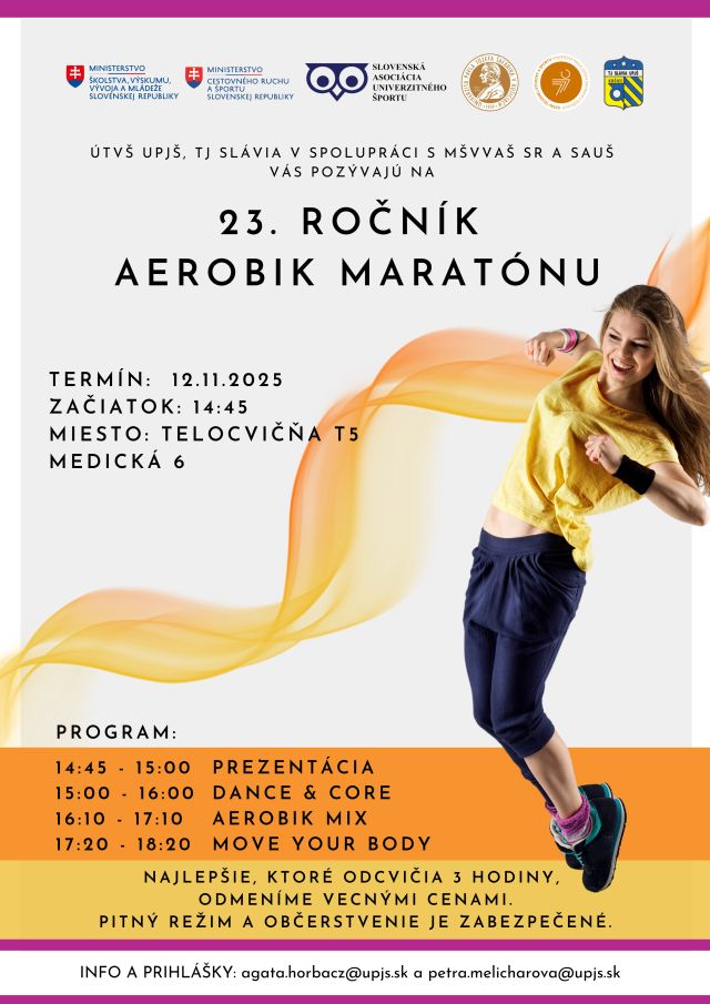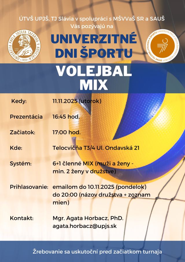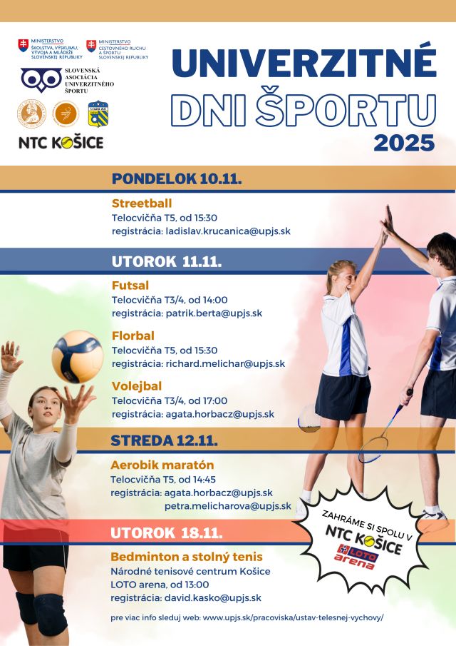 | Univerzitné dni športu 2025 – plagát a informácie 10.11. Streetball – ladislav.krucanica@upjs.sk 11.11. Futsal – patrik.berta@upjs.sk 11.11. Florbal – richard.melichar@upjs.sk 11.11. Volejbal – plagát – agata.horbacz@upjs.sk 18.11. Bedminton a stolný tenis – Link na prihlásenie* – info: david.kasko@upjs.sk Aerobik maratón – 23. ročník – plagát 12.11. info: agata.horbacz@upjs.sk *link na prihlásenie ešte dodáme |