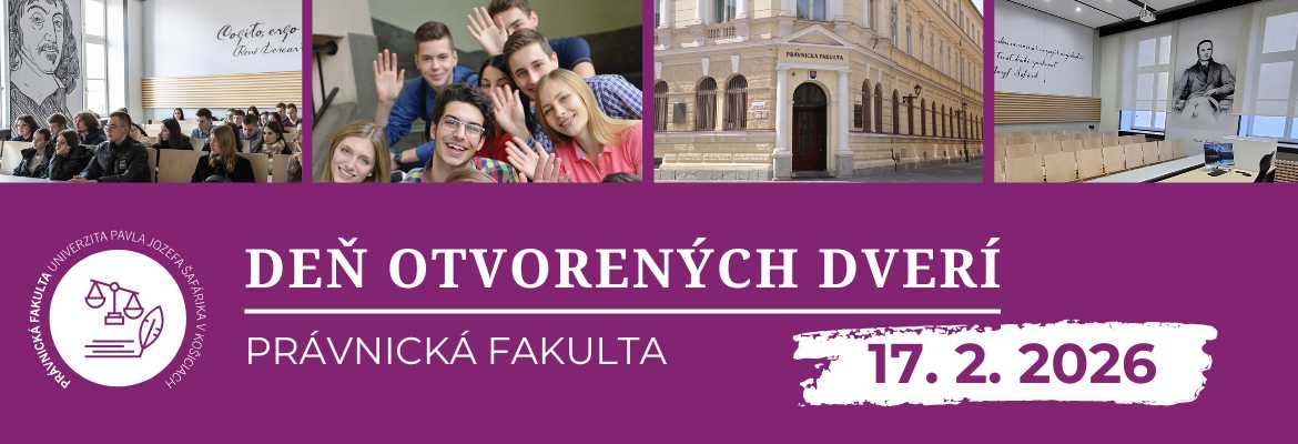 Právnická fakulta UPJŠ v Košiciach srdečne pozýva záujemcov o štúdium na Deň otvorených dverí, ktorý sa bude konať v utorok 17. februára 2026 od 09,30 hod. v priestoroch budovy fakulty na Kováčskej 26. Tešíme sa na Vás! Program