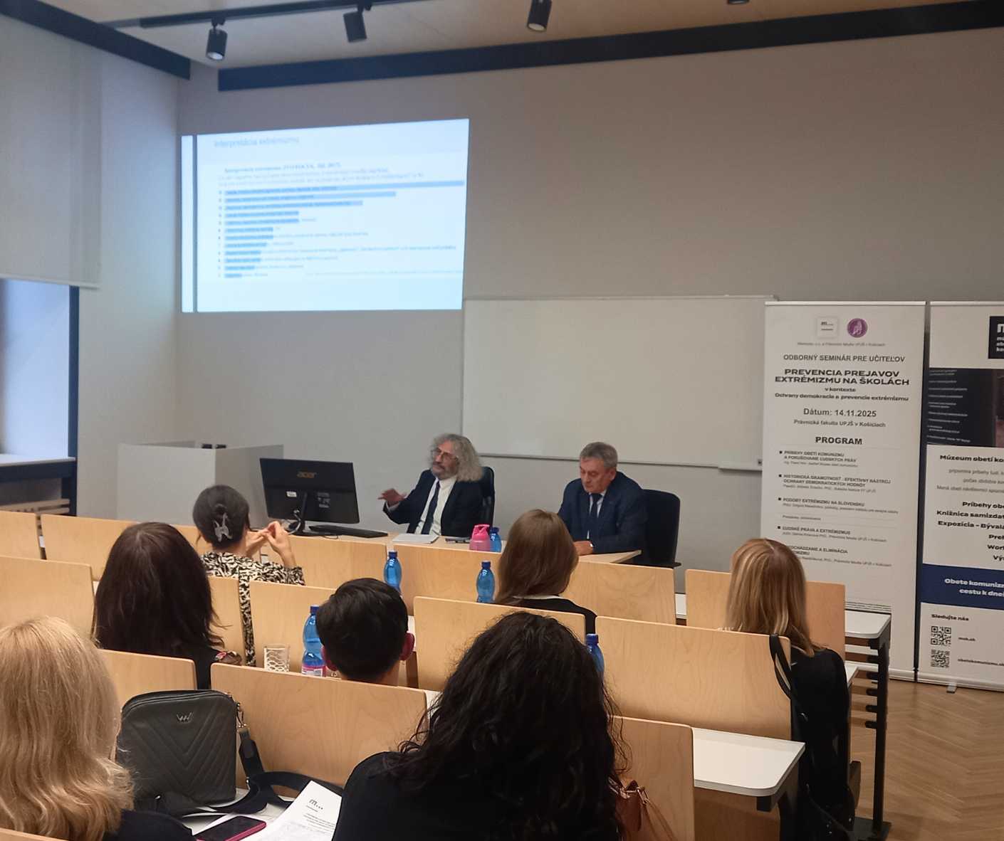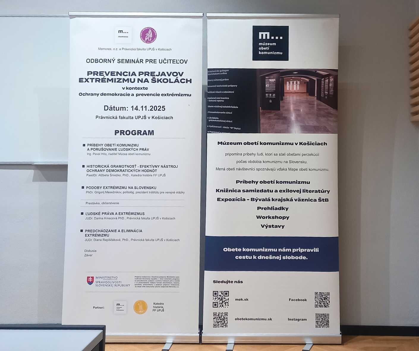 Dňa 14. novembra 2025 sa na pôde Právnickej fakulty UPJŠ v Košiciach v spolupráci s Múzeom obetí komunizmu uskutočnil odborný seminár na tému „Prevencia prejavov extrémizmu na školách v kontexte ochrany demokracie a prevencie extrémizmu“. V rámci programu seminára vystúpili Ing. Pavol Hric, riaditeľ Múzea obetí komunizmu, PaedDr. Alžbeta Śnieżko, PhD. z Katedry histórie Filozofickej fakulty UPJŠ v Košiciach, PhDr. Grigorij Mesežnikov, prezident Inštitútu pre verejné otázky, ako aj členky Katedry ústavného práva a správneho práva Právnickej fakulty UPJŠ v Košiciach – JUDr. Darina Kmecová, PhD. a JUDr. Diana Repiščáková, PhD. Uvedeným podujatím sme si pripomenuli odkaz 17. novembra, Dňa boja za slobodu a demokraciu.