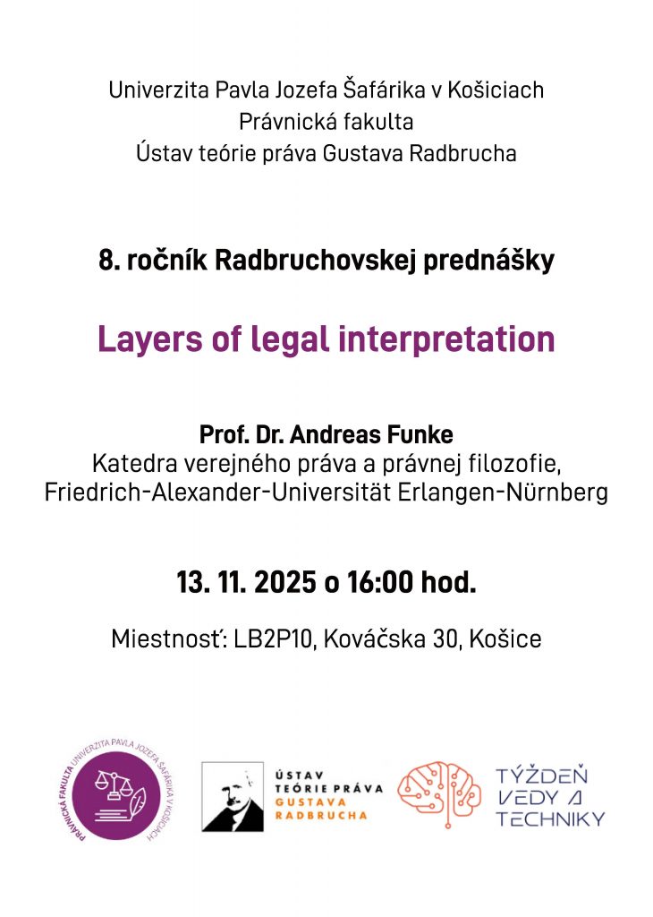 Ústav teórie práva Gustava Radbrucha, Právnickej fakulty Univerzity Pavla Jozefa Šafárika v Košiciach Vás pozýva na 8. ročník Radbruchovskej prednášky, ktorú prednesie Prof. Dr. Andreas Funke pôsobiaci na Katedre verejného práva a právnej filozofie, Friedrich-Alexander-Universität Erlangen-Nürnberg. Prednáška sa uskutoční 13.11.2025 o 16.00 hod. v miestnosti LB2P10, Kováčska 30.