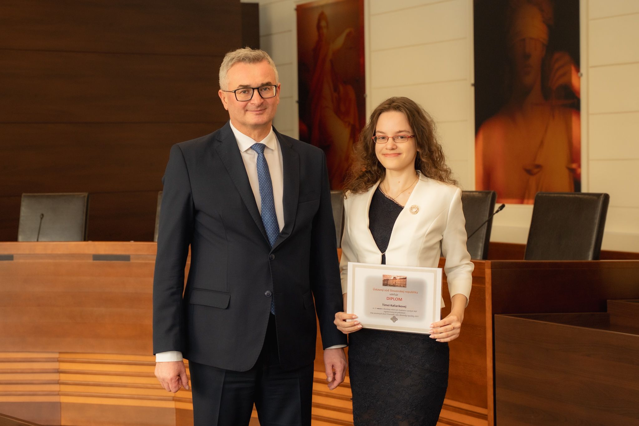 Kancelária Ústavného súdu Slovenskej republiky organizovala pri príležitosti Dňa otvorených dverí Ústavného súdu Slovenskej republiky esejistickú súťaž pre študentov vysokých škôl, tohto roku na tému „Strážcovia právneho štátu – Kto a ako stráži právny štát?“. Výhercov súťaže prijal a ocenil predseda Ústavného súdu Slovenskej republiky, JUDr. Ivan Fiačan, PhD.. Prijatie sa uskutočnilo dňa 6. novembra 2025 v priestoroch ústavného súdu. Tešíme sa z úspechu študentky tretieho ročníka bakalárskeho stupňa štúdia, Tímei Kaliarikovej, ktorá sa umiestnila na treťom mieste.