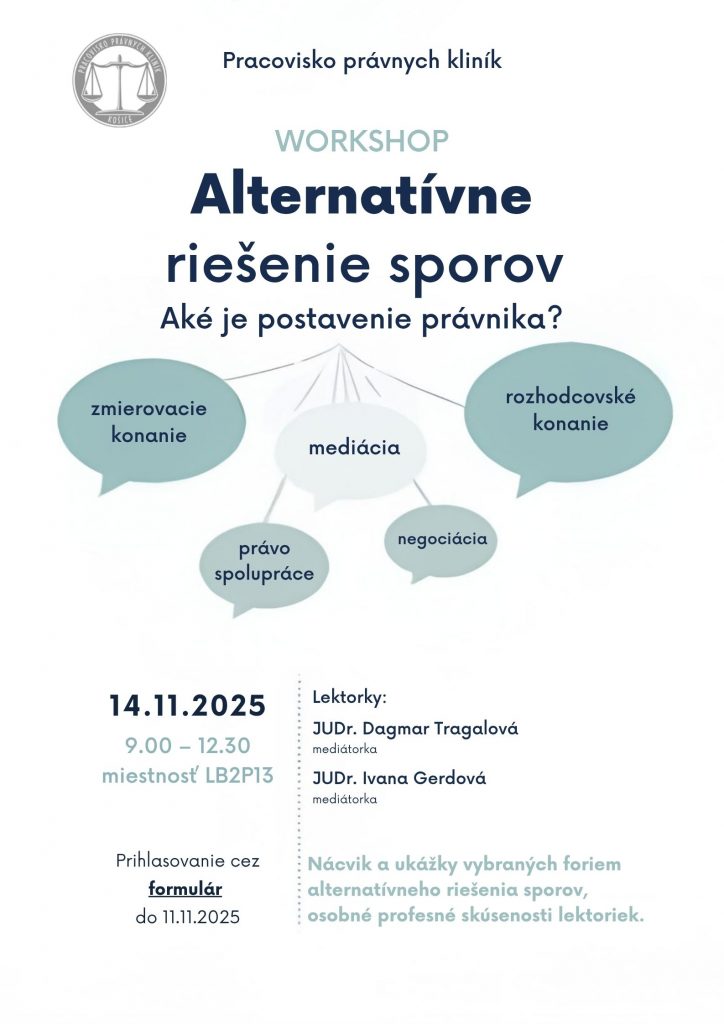 Prihlasovanie na workshop sa realizuje prostredníctvom prihlasovacieho formulára WORKSHOP právnych kliník Prihlasovanie – vyplniť formulár a to najneskôr do 11.11.2025.