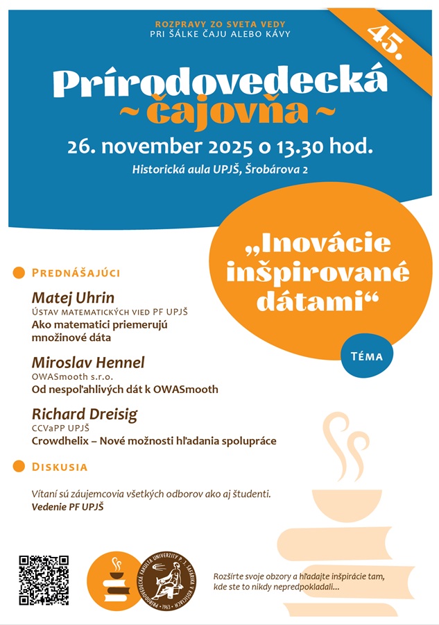Dňa 26. novembra 2025 sa v Historickej aule UPJŠ, nachádzajúcej sa v priestoroch budovy rektorátu UPJŠ, Šrobárova 2, uskutoční vedecká čajovňa na tému Inovácie inšpirované dátami