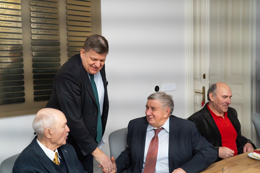 S jubilantmi sa stretli dekan doc. RNDr. Roman Soták, PhD., predseda AS PF UPJŠ doc. RNDR. Rastislav Jendželovský, PhD., prodekan pre vzdelávanie doc. RNDr. Marián Kireš, PhD. a prodekan pre vonkajšie vzťahy doc. Mgr. Michal Gallay, PhD..