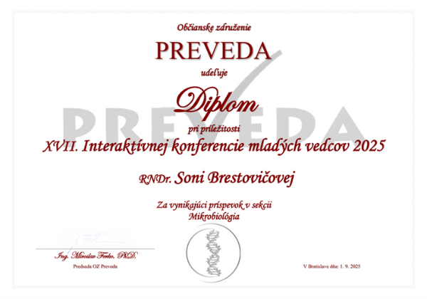 Na XVII. Interaktívnej konferencii mladých vedcov 2025 získala RNDr. Soňa Brestovičová, doktorandka Katedry mikrobiológie Ústavu biologických a ekologických vied PF UPJŠ v Košiciach, ocenenie za vynikajúci príspevok v sekcii Mikrobiológia.