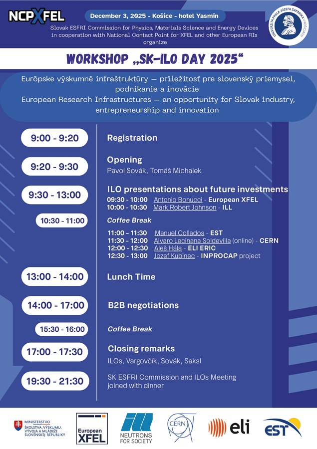 NCP XFEL and ERI na  PF UPJŠ inicioval a organizačne zabezpečil  workshop, ktorého cieľom je prepojiť slovenské firmy s inovačnými zámermi ESFRI výskumných infraštruktúr. Pozvanie prijali „Industrial Liason Officers (ILO)“ z partnerských medzinárodných centier, aby upriamili pozornosť nášho  priemyslu na príležitosti vzájomnej spolupráce a rozvoja. Workshop sa uskutoční 3.12.2025 v priestoroch hotela Yasmín.