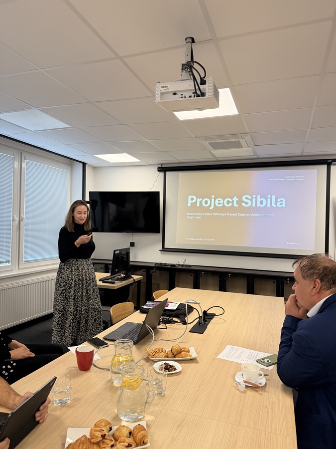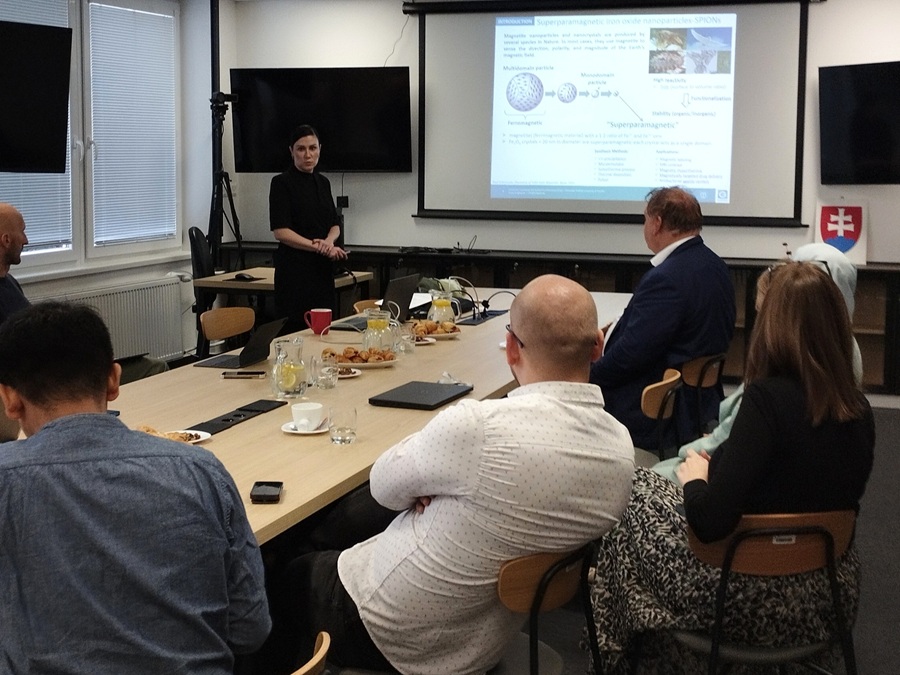 The project connects P. J. Šafárik University in Košice, FunGlass at Trenčín University of A. Dubček, and the University of Veterinary Medicine and Pharmacy in Košice. FunGlass representatives Dr. Zulema Vargas and Dr. Martina Vitázková presented new results on mesoporous SiO₂, SPIONs, and magnetic MBG nanocomposites. Dr. Martin Michálek and PhD students Daniela Jaramillo and Radhika Goyal also took part. UPJŠ representatives prof. Vladimír Zeleňák, Dr. Nikolas Király, Dr. Eva Beňová and PhD student Miratul Alifah.
