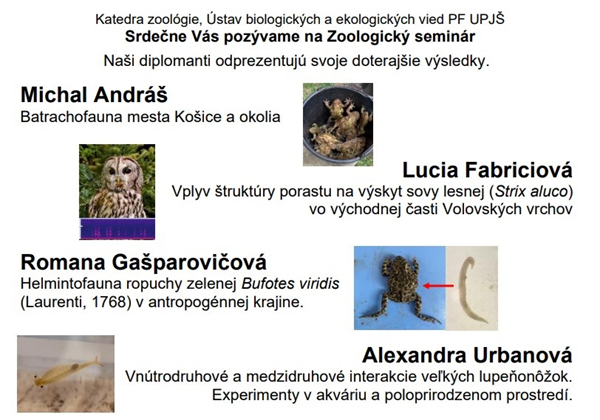 Cieľom Zoologického seminára je predstaviť študentom a ostatným nadšencom zoológie zaujímavé témy, ktoré sa v tejto oblasti riešia na Katedre zoológie ÚBEV PF UPJŠ, ale aj na iných pracoviskách mimo našej univerzity. Na najbližšom seminári budú predstavené niektoré témy záverečných prác, ktoré riešia študenti 2. ročníka magisterského štúdia.